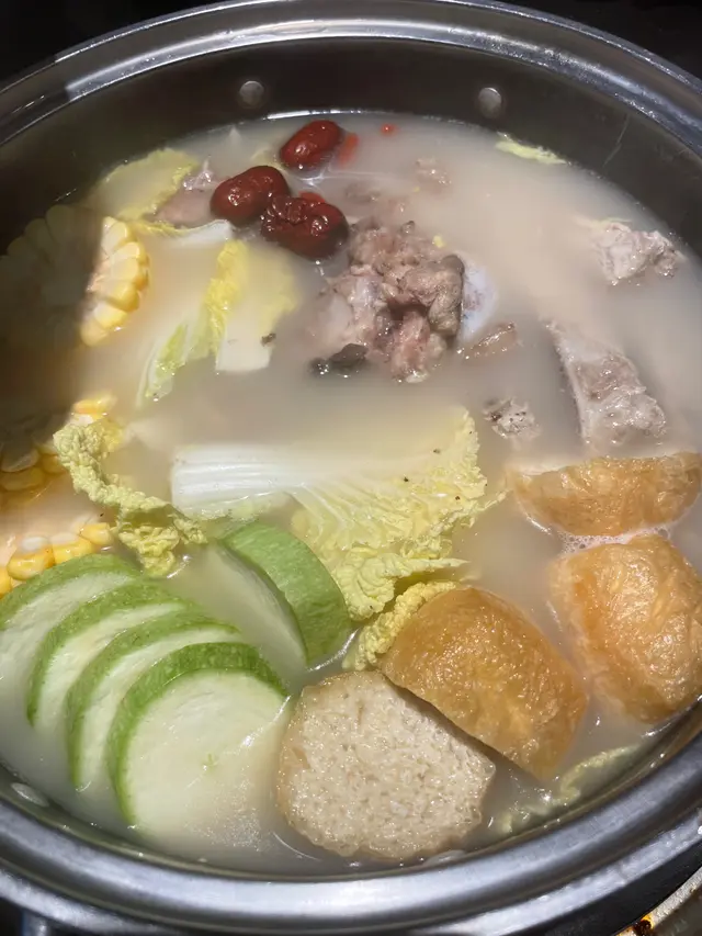 火鍋湯底選擇繁多,我哋就揀咗豬骨湯底,清澈卻鮮味十足,配料又多。
