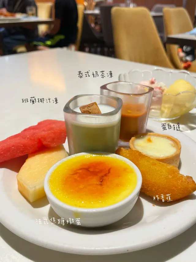 佢哋嘅甜品區都花咗幾多心思,除咗有朱古力噴泉之外,隔離都有做幾款熱食嘅甜品,好似即製嘅窩夫、疏乎厘,亦都會有專人幫手舀Movenpick雪糕,亦都有班蘭椰汁凍、泰式奶茶凍、蛋白撻、炸香蕉、法式焦糖燉蛋呢啲甜品可以任拎,咁多款入面最鍾意蛋白撻,外皮熱辣辣又脆口,入面做得幾軟滑🧁🧁🧁佢哋都有現場即做嘅火焰雪山蛋糕,有噱頭同埋都幾好食🔥🔥🔥