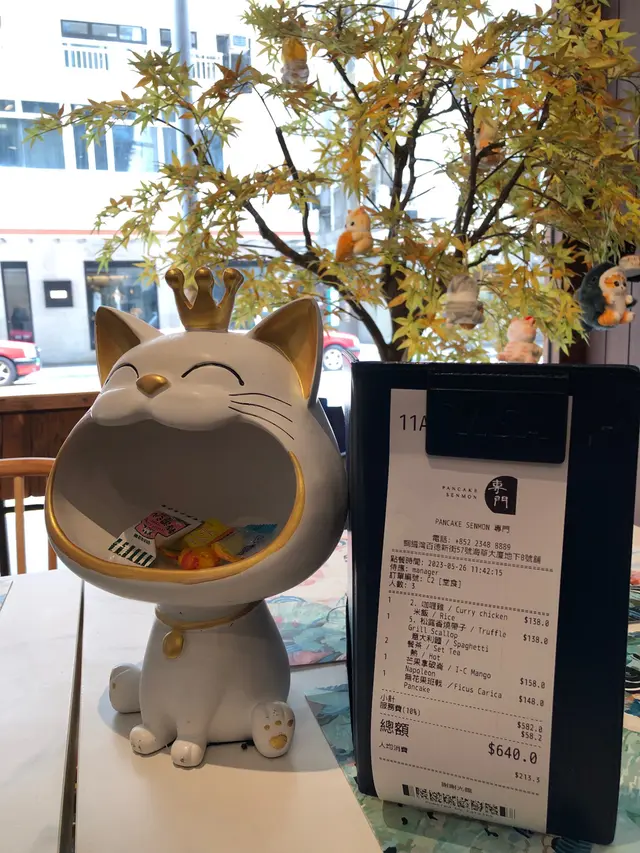 侍應把大口貓咪與賬單一拼奉上,貓咪口內有4粒糖俾食客享受😋,是日午餐$640,人均消費$214!餐廳的主食,收費較為合理,每款$138,但食物味道一般,份量也較少,反而甜品,雖然賣相和味道也很好,但收費較貴,伯爵茶無花果班戟$148、芒果麻薯雪糕拿破崙$158!
