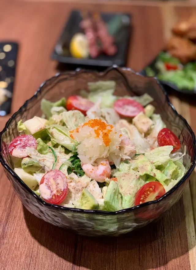 沙律份量超級多,材料有甜蝦、蟹籽、蘋果、牛油果、柚子肉、中華沙津、車厘茄和沙津菜,配上柚子汁及芝麻醬,非常豐富,味道清新可口。甜蝦最美味,鮮甜嫩滑,可惜只有三隻。