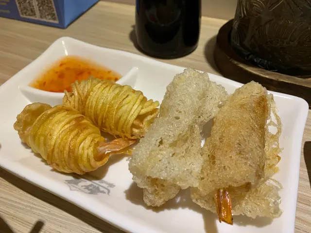 左邊蝦卷好少少咁啦,用薯仔絲卷住條蝦仔黎炸。