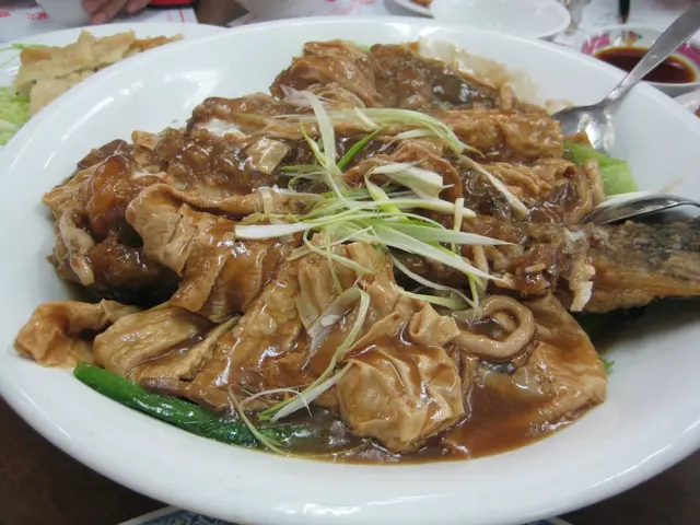 酱烧骨。本来是完整滑溜的长方体拿上来的,我还没拿出相机某阿叔抄起刀叉对它就是一阵狂操。其实很像换了调味的东坡肉嘛,酱汁再甜再咸一些更好了。不过有高压锅制作的嫌疑