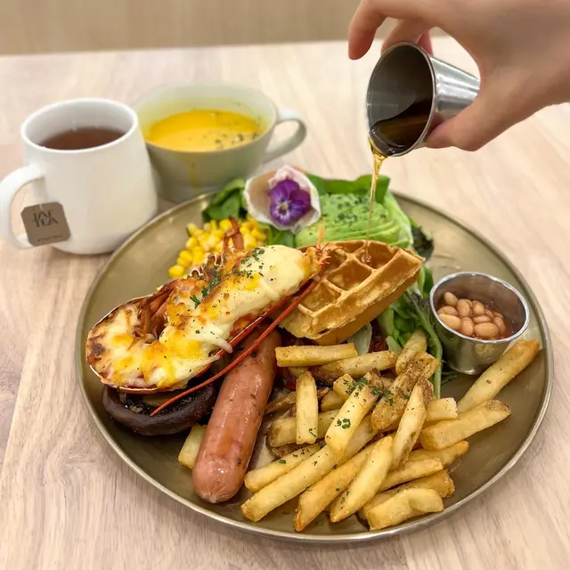原來all day已經進化到有龍蝦🤪芝士鋪滿面,龍蝦肉比想像中爽彈,唔會雪到霉哂!平時通常係麵包,呢度就係窩夫,鹹中一點甜!薯條好香脆,鹹度適中,意外地好食。其餘嘅餸擺滿哂成隻碟大滿足😝