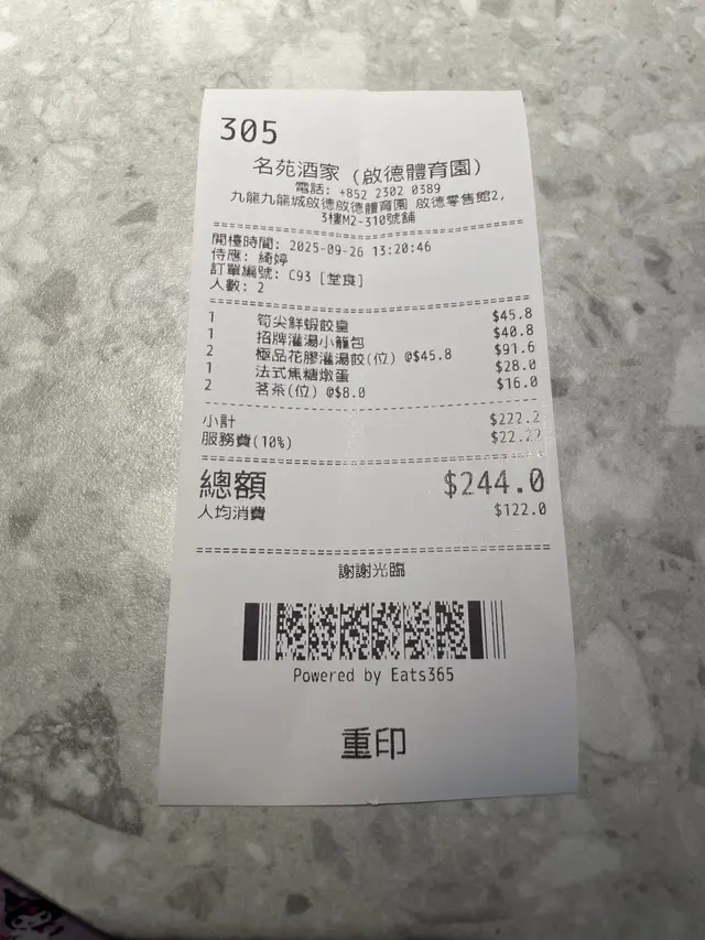 • 價格 8.5/10:總額 $244.0(人均 $122.0)。