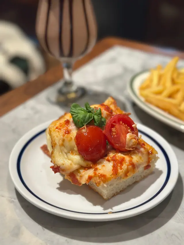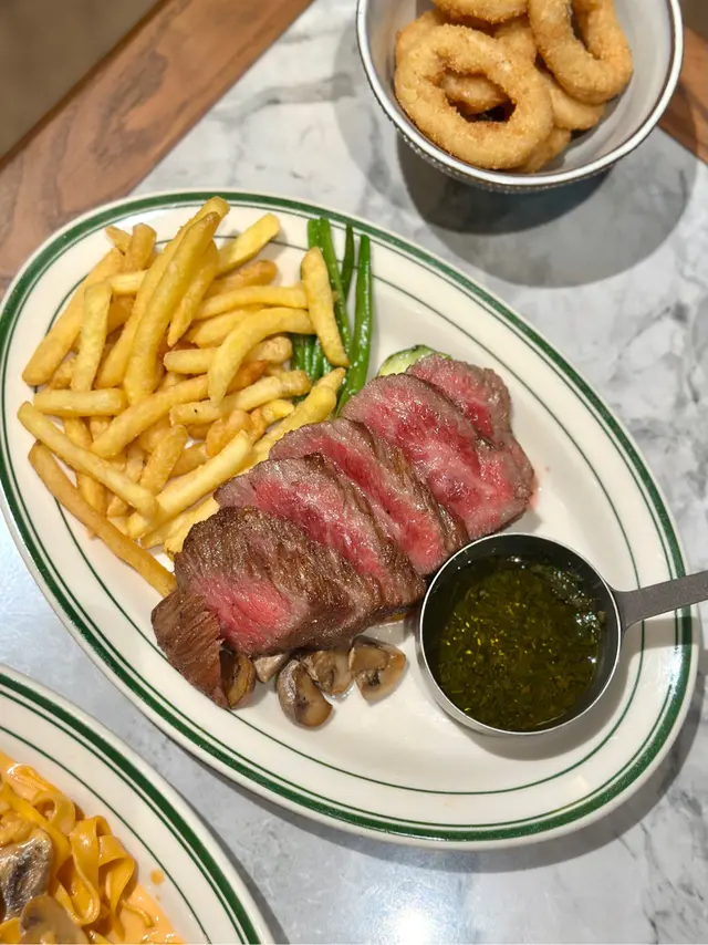 選擇和牛套餐,除了會附上清新開胃的沙律🥗,星期一至五可以無限任食✨外皮香脆中間軟熟煙韌的瑪格麗特披薩🍕、金黃酥脆的薯條🍟及香脆的洋蔥圈🧅