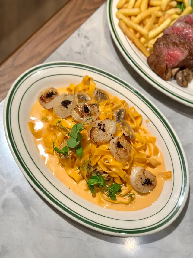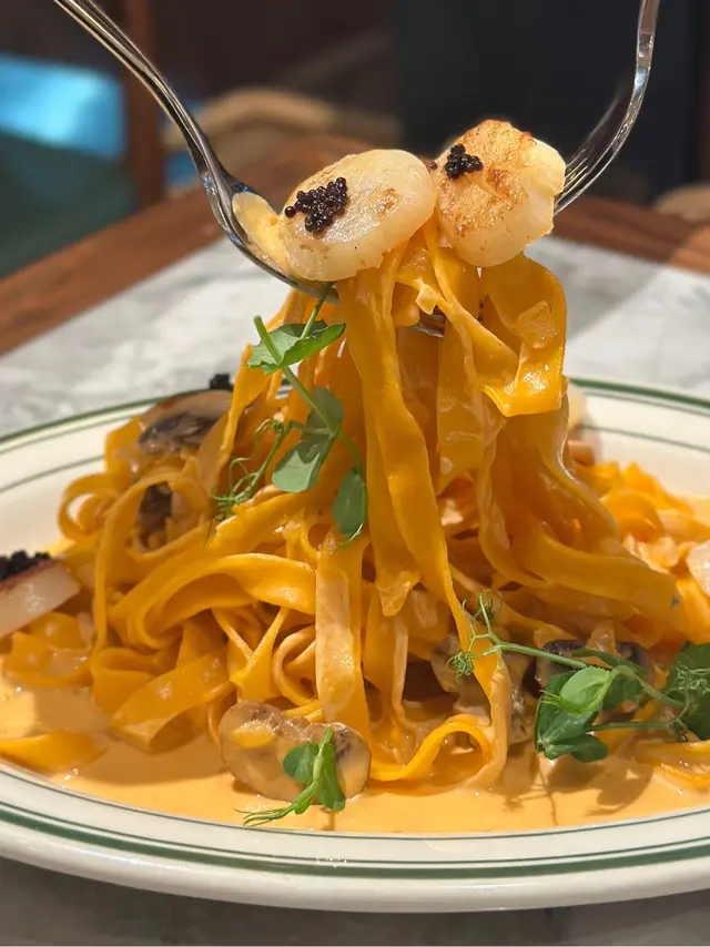 手工闊麵均勻地沾滿了鮮美濃郁的海膽忌廉醬汁,加上鮮甜燒帶子與蘑菇,再以鹹香的黑魚籽點綴提鮮。