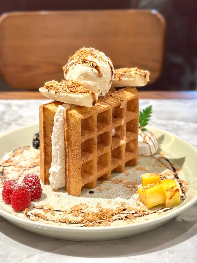 窩夫外層香脆帶有蛋香味,中間是芝士蛋糕忌廉,加上香甜的焦糖香蕉、雪糕、朱古力醬及清新雜莓,味道和口感豐富。