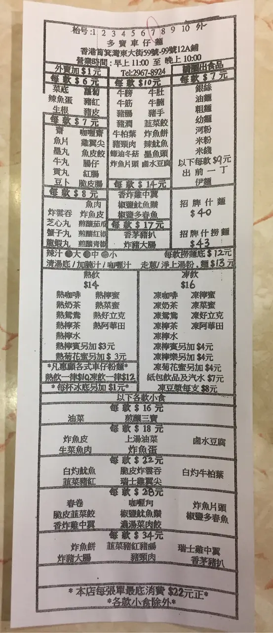 喜出望外的車仔麵 crystalcheerLevel 12017-04-17609 views Follow 車仔麵檔到處都有,這間的餸比一般的車仔麵檔多選擇,在門外看到有椒鹽魷魚鬚,就把我吸引了進去!先看一看點餐紙,價錢也不便宜,我想吃的餸都介乎$10-$14一款... 不過別擔心,現在是下午茶時間問過店員$14的餸也可以選!! 我點了魷魚鬚、豬紅、牛膀、冬菇河(咖喱湯底)豬紅好入味,不會有怪血味,軟硬度適中 冬菇炆到好腍,有菇香 牛膀雖然只得2片,但切得頗厚, 像吃豬潤一樣會「起沙」 魷魚鬚即叫即炸,炸得非常鬆化,魷魚香十足! 這個下午茶整體十分滿意,$35豐富的四餸麵還送熱飲,有機會一定會再幫襯!The above review is the personal opinion of a user which does not represent OpenRice's point of view.2Share喜出望外的車仔麵 多寶車仔麵 https://s.openrice.com/QrKT0zPqL00Report Post Ratings4Taste3Decor3Service3Hygiene5ValueDining MethodDine InSpending Per Head$35 (Tea)