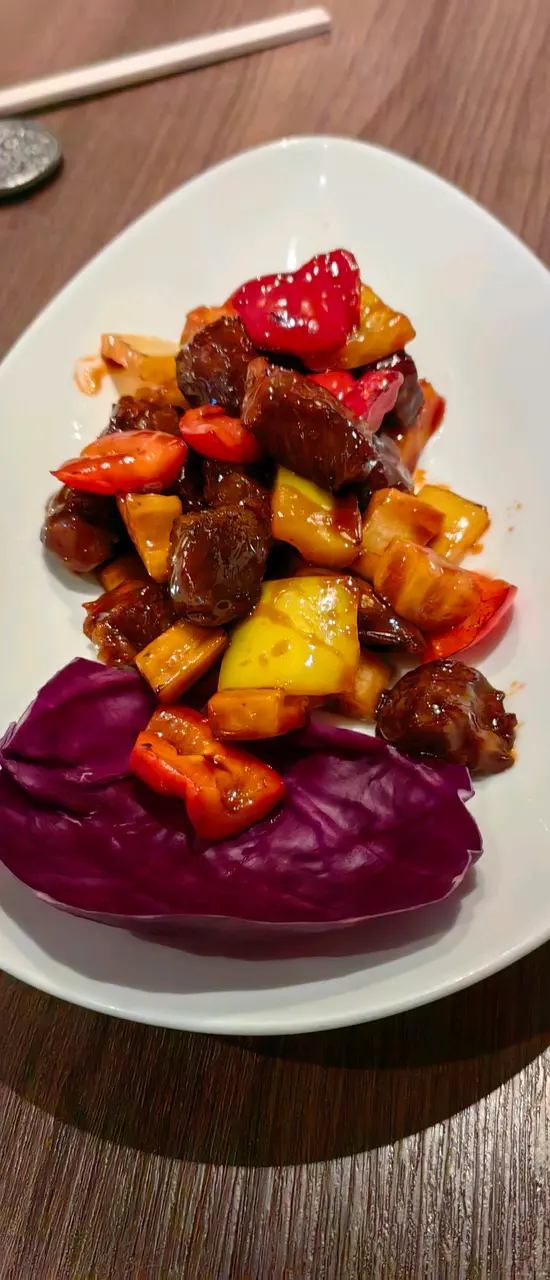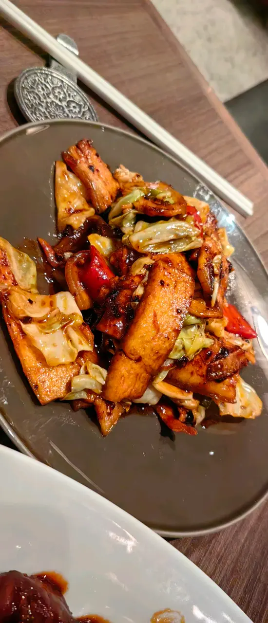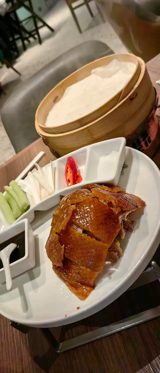 利園的新餐廳,環境不錯,裝修有歐洲的感覺,中間的酒吧區域特別有氣氛,新中式的菜式十分精美,從用餐區域可以透過霧化玻璃隱約看見廚房的炒菜火焰十分有感覺。今日兩個人四個菜,和牛柳,非常喜歡,醬汁和肉汁平衡的十分好,回鍋肉惹味,豆瓣醬味突出,時候下飯。茶樹菇上湯豆苗十分爽口。最後一道是北京片皮鴨,等待時間比較長,半隻擺盤很好,麵皮有加熱設施保溫,鴨肉不柴,鴨皮脆而不油,半隻分量剛好,人多建議整隻。開瓶費問了,要500,要用酒的鼓勵在這裡點。