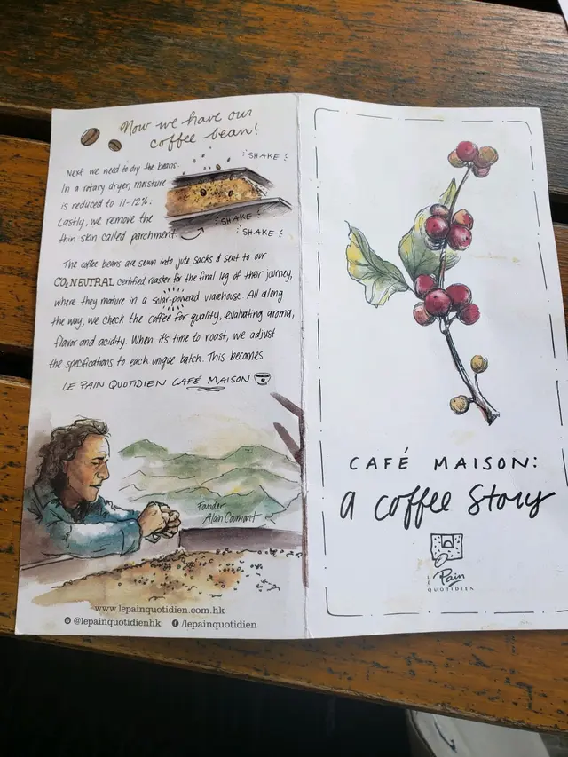 枱面還有單張,圖文並茂地說明這咖啡豆的故事,源自秘鲁的有機咖啡豆,種植於海拔 5,000 英呎以上的熱帶雨林,以人手採摘收割。令這Cappaccino 頓時顯得與别不同,引人入勝!