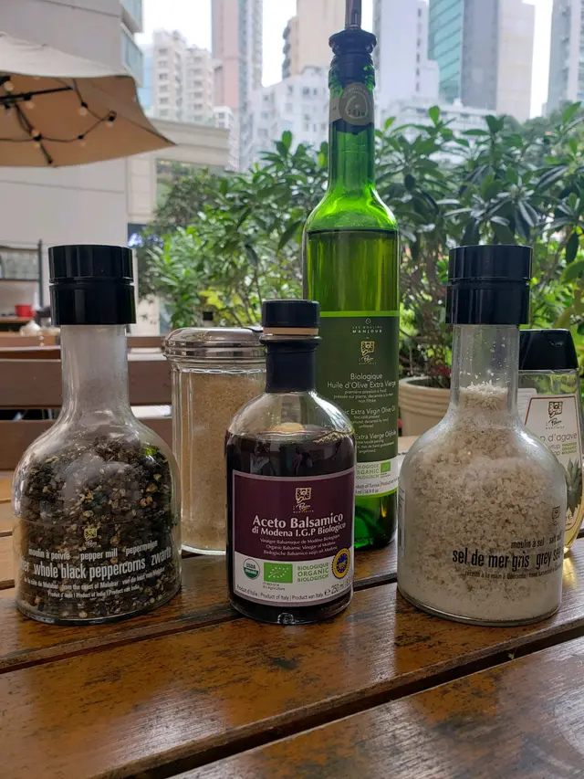 有機意大利醋、突尼西亞冷壓初榨橄欖油,原粒印度黑胡椒,有機龍舌蘭糖漿,手採灰海海鹽等。加了意大利醋和橄欖油的沙律,更添美味。