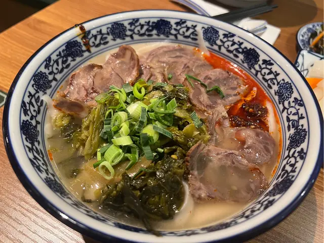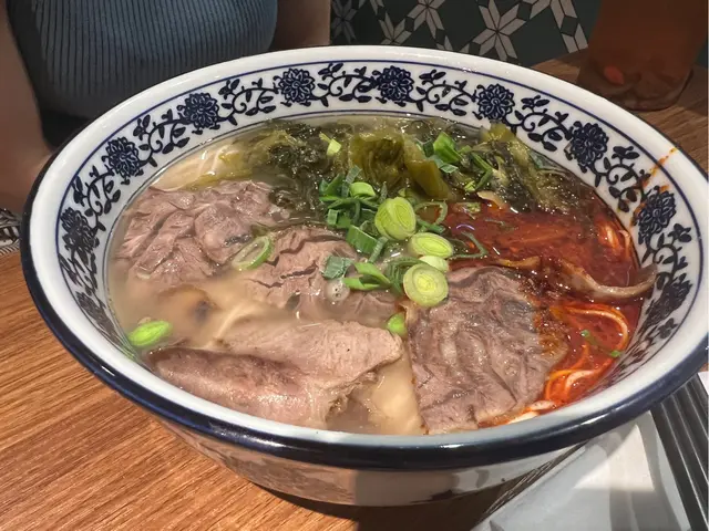 店內的手工麵選擇豐富,每一種麵型都有其獨特的魅力。我們點了兩款不同的麵:酸菜牛肉刀削麵和酸菜牛肉毛細麵。刀削麵口感煙韌彈牙,讓人回味無窮;而毛細麵則掛汁力強,更能帶出湯汁的鮮美。湯底搭配辣椒油,為整碗麵增添了一份溫暖和香辣,讓人食慾大開。