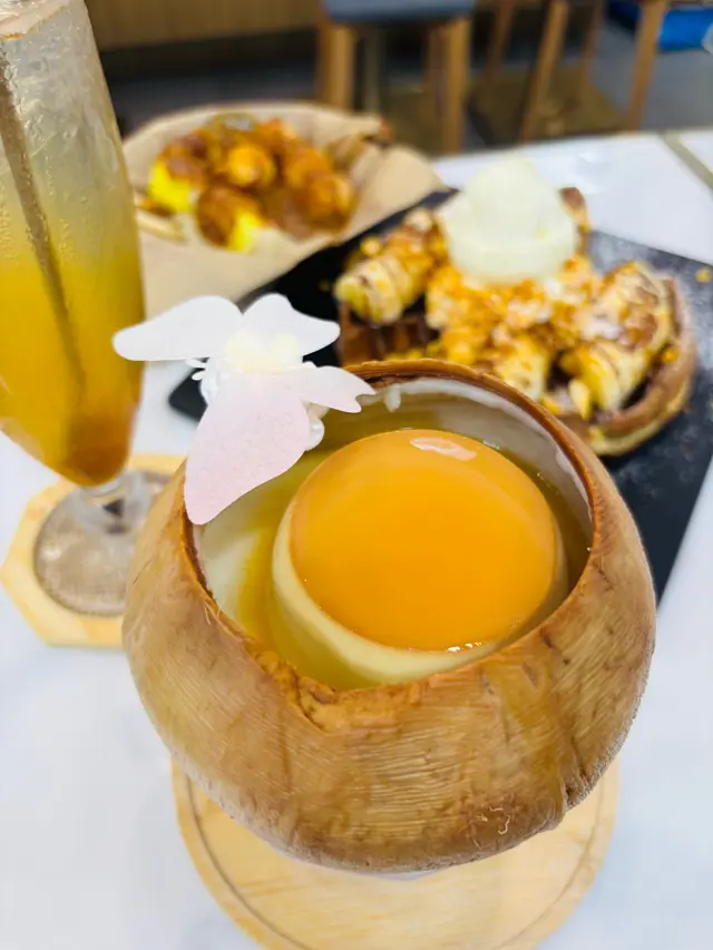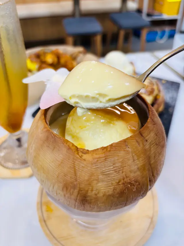 2️⃣ 【焦糖布甸椰皇|會抖動的治愈系】 用勺子敲開焦糖脆殼瞬間太治愈了~椰香布甸冰涼滑嫩 裡面還有新鮮椰肉刮絲 夏日吃這個瞬間降溫❄️