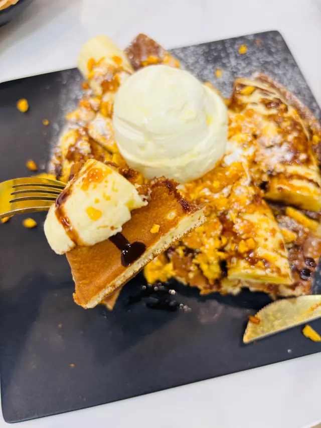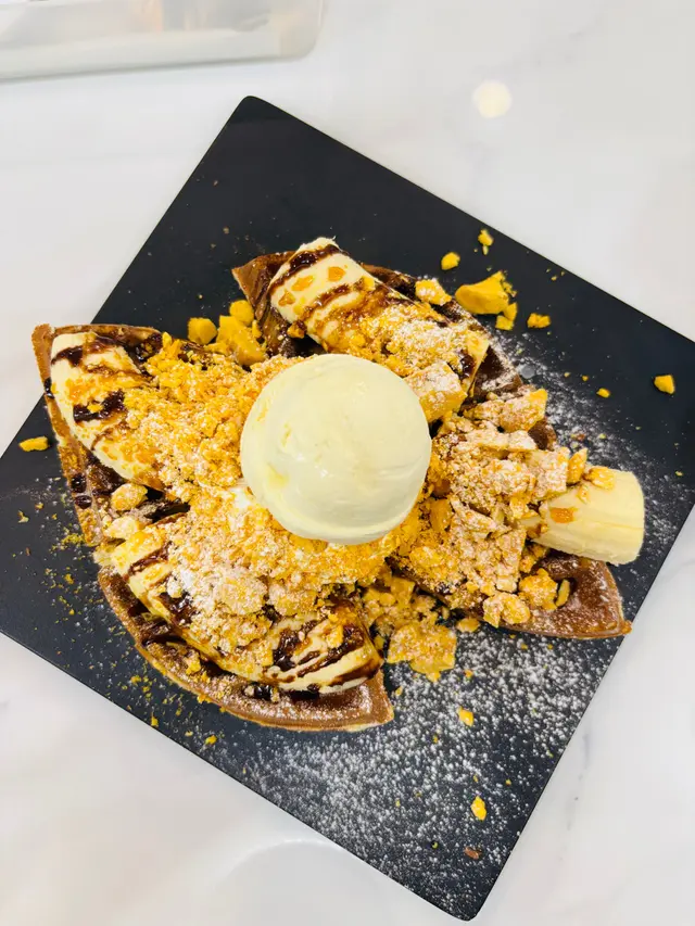 3️⃣ 【焦糖脆脆香蕉鮮忌廉窩夫|冷熱雙重奏】 現烤窩夫外脆內軟+雪糕冰火交融!焦糖脆脆和鮮忌廉給得超豪邁 拍照要快不然雪糕會塌🍦