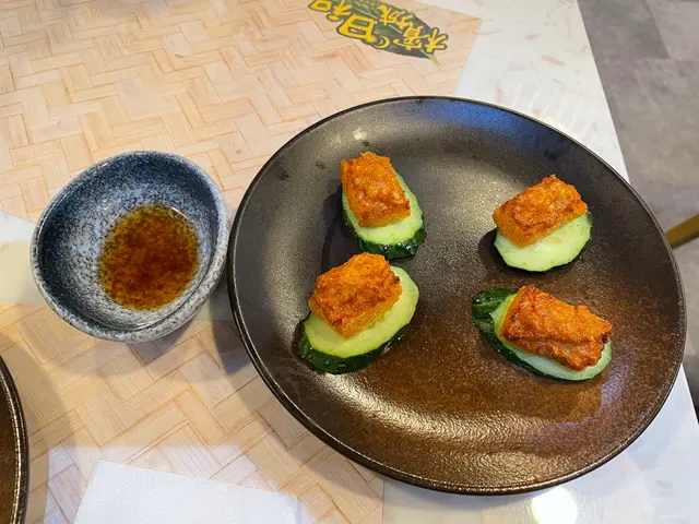 首先上菜的是小食﹕馬來沙嗲雞脾肉串和一口馬拉盞蝦多士。前者有兩串雞脾肉,沙嗲醬汁味道剛好,甜甜地幾開胃。一口馬拉盞蝦多士有四件,份量較的式(作為小食還好),用青瓜片托底感覺頗新鮮。