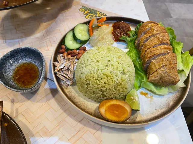 接下來是主餐,第一款是鮮班蘭椰漿飯配五香滷肉卷及檳城辣醬菜,滷肉卷上菜時熱辣辣,表層脆卜卜,加上魚乾、酸菜及辣醬菜作配料,味道口感層次都豐富,惟略嫌班蘭椰漿味道不夠香濃,如飯溫熱一點會更好。