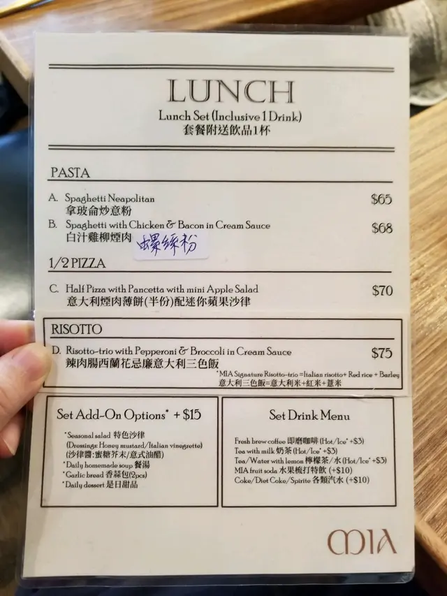 經濟不好,很多食店都関門大吉,從面書得知美孚開了十多年的 MIA Pasta & Pizza於十月七日結束營業,今天中午有空用行動支持及懷念一下,食店裝修簡潔有點小,座位也多,所以晚市常滿,中午套餐有4款包飲品,加15元便可配其他小食,這兒的意大利煙肉薄餅香脆好味