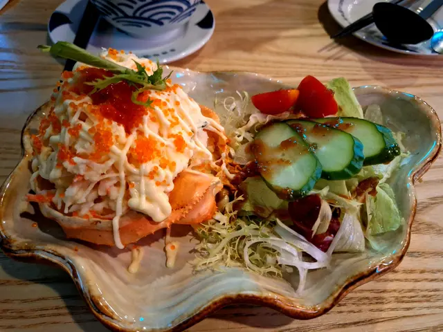日本家庭料理中的薯仔沙律,簡單卻美味。平凡的食材加上三文魚籽大大加分,微酸蛋黃醬非常開胃。一旁沙律菜重點在於秘製醬汁,醬油、柚子、醋加起來出奇地夾。