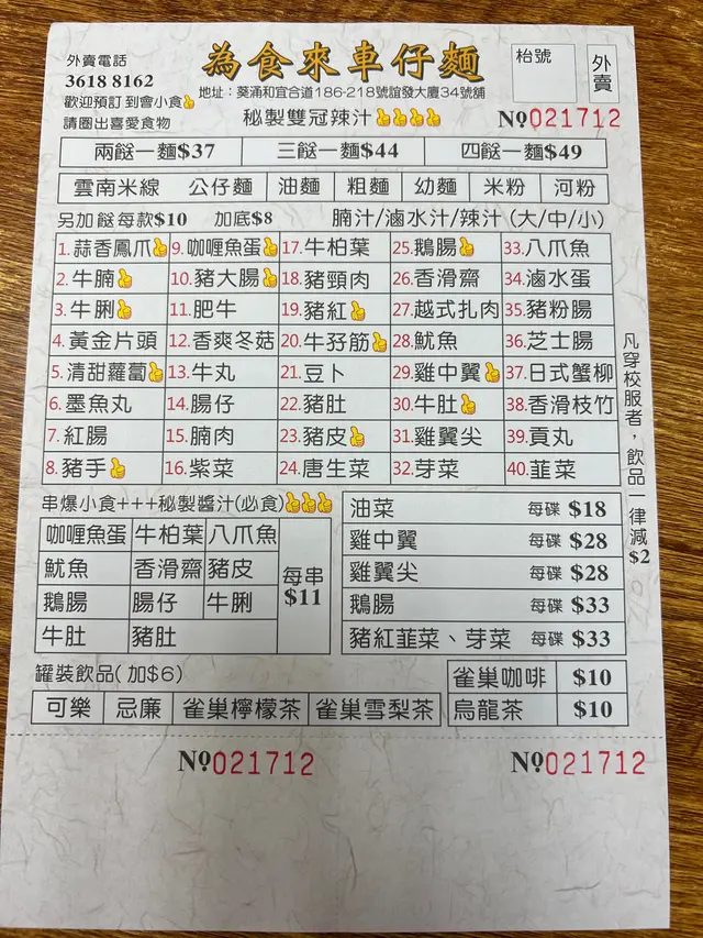 四餸車仔麵|打工仔必食 Salad_happyshareLevel 42023-03-29670 views Follow 離唔開係葵涌食Lunch🥺同飯腳去咗食車仔麵,大家一齊四餸怒食。四餸$49🍜 四餸一麵 $49牛腩·牛肚·魚蛋·鳳爪牛腩:少少乾柴感牛肚:夠腍身👍🏻魚蛋:一般,不過不失鳳瓜:偏腍夠入味四餸$49🍜 四餸一米線 $49豬紅·豬大腸·貢丸·生菜豬紅:爽口比較結實,唔會一夾就散。啲人話豬血+牛血製成嘅豬紅比較易形成一磚磚。個人喜歡結實的✅👍🏻 #補血豬大腸:比較有咬口,無異味👍🏻貢丸:無特別生菜:新鮮腩汁湯底香濃👍🏻偏甜仲有麵面少少辣呢間車仔麵好適合喜歡味濃同食辣人士👍🏻📍星期六休息飲品:汔水 $6罐11The above review is the personal opinion of a user which does not represent OpenRice's point of view.LikeShare四餸車仔麵|打工仔必食 為食來車仔麵 https://s.openrice.com/QrKT0rBn800Report Post Ratings5Taste4Decor5Service5Hygiene5ValueRecommended Dishes四餸$49四餸$49Dining MethodDine InSpending Per Head$55