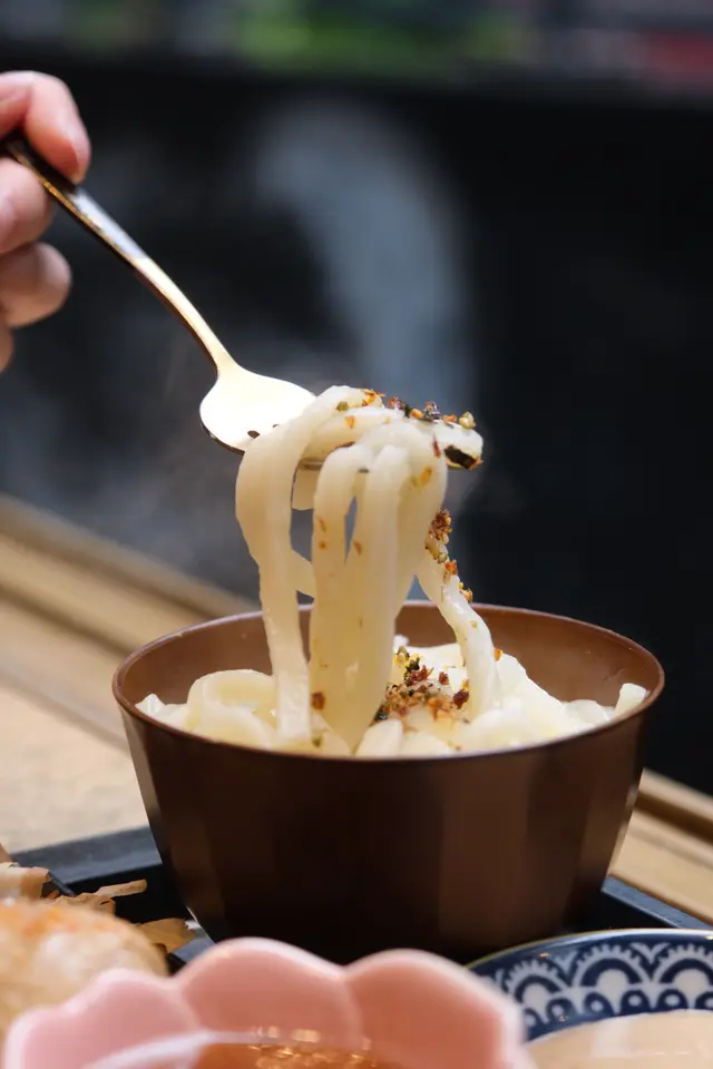 定食好豐富!有前菜、關東煮有豆皮大根芋絲、熱烏冬胡麻醬、雞卷酒釀汁、蛋汁,雞卷切開沾沾酒釀汁,雕酒味濃郁!再沾沾蛋汁一齊食🥰