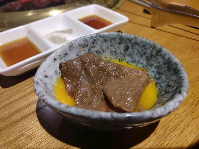 枱上面有鹽 同埋柚子醬汁, 建議落啲鹽配烤好嘅牛肉食, 可以 食到牛肉本身嘅香同濃未, 一塊牛肉配一口白飯味道嘅中和 十分好。