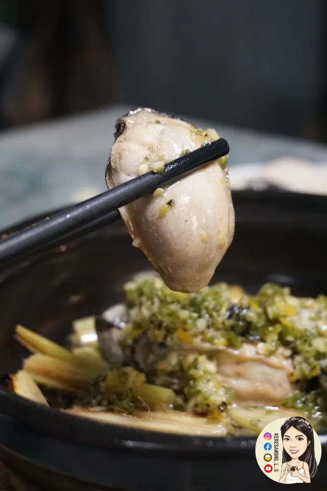 上檯開蓋, 煲仔熱得還是滋滋聲香噴噴, 每隻蠔非常肥美脤卜卜, 蠔味濃郁又juicy, 夾集香茅烤椒碎粒食, 辣辣地, 惹味開胃。