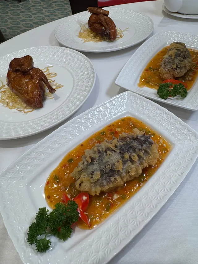 川汁脆皮酿辽参:外皮炸到酥脆、弹形厚身的辽参里面是嫩嫩的虾肉馅料,让人一试难忘!