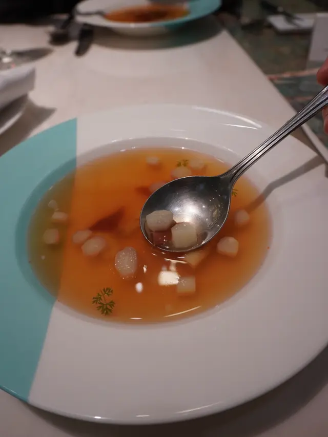 白露荀法式清雞湯 ,傳統嘅法式清雞湯配西班牙黑毛豬火腿,清甜又帶出淡淡鹹香🥣