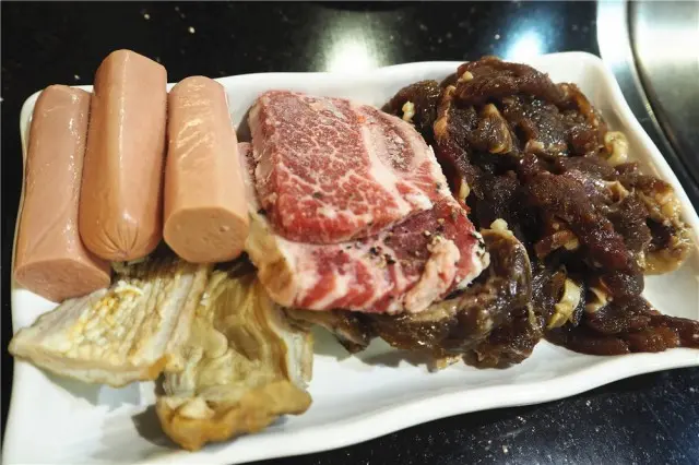 我拎左小牛排、調味牛肉、腸仔、大腸,