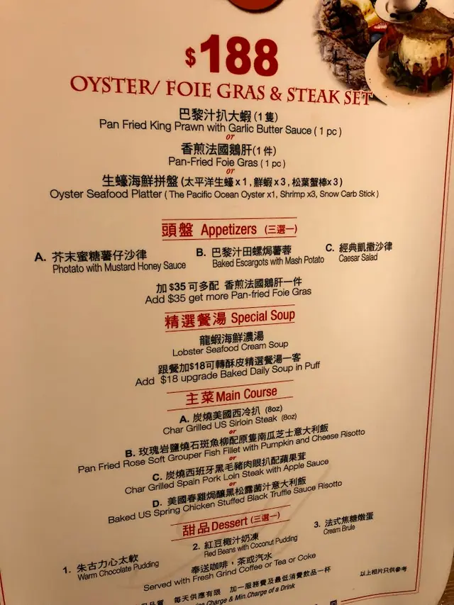 總括黎講 $188 包哂小食頭盤餐湯主菜飲品甜品