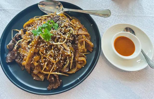 首先上嘅係乾炒牛河,好香,有啲焦香,睇落個色水好靚仔啦,碟底冇油淋淋,食落都好香,炒功我俾80分,有水準嘅牛河