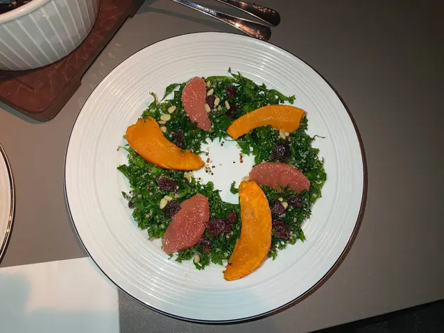 散落細塊的超級食物羽衣甘藍,比大大塊的堅實紙皮口感好上太多,加了橄欖油的油香,松子仁的爽脆,當然還不夠味,加入南瓜跟西柚就既甜又juicy了!