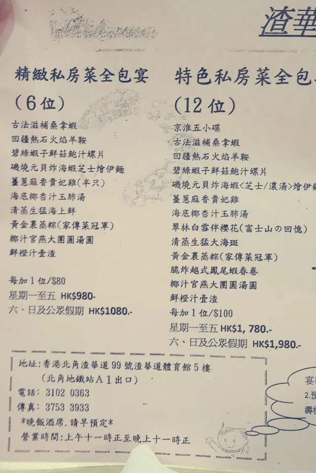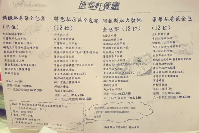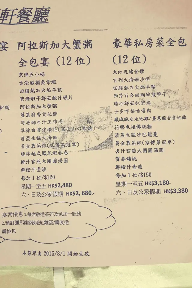 食肆走的是全包宴套餐路線。有6人餐及12人餐的選擇,並可按人頭加位。價錢已包茶芥及免收加一。百多元已可以吃到12道包含有蝦有羊有海斑的菜式,再加百多元甚至可以去吃乳豬全體及佛跳牆,便宜得有點不可思議。