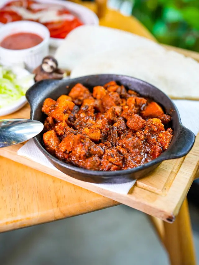 🏵[食評]墨西哥大廚家傳秘製。燒豬、牛肉雙拼,味道甜甜哋又帶點smoky,用鑄鐵小煎pan上枱,夠哂熱辣辣,配埋蕃茄片、生菜絲同薄餅夾埋一齊食,如果喜歡食辣可以加入辣醬汁,味道提升多重滋味。