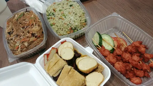 我們叫了沙嗲串燒, 齋滷味拼盤, 油雞素肉崧綠豆粉絲, 崧子香椿素肉炒飯