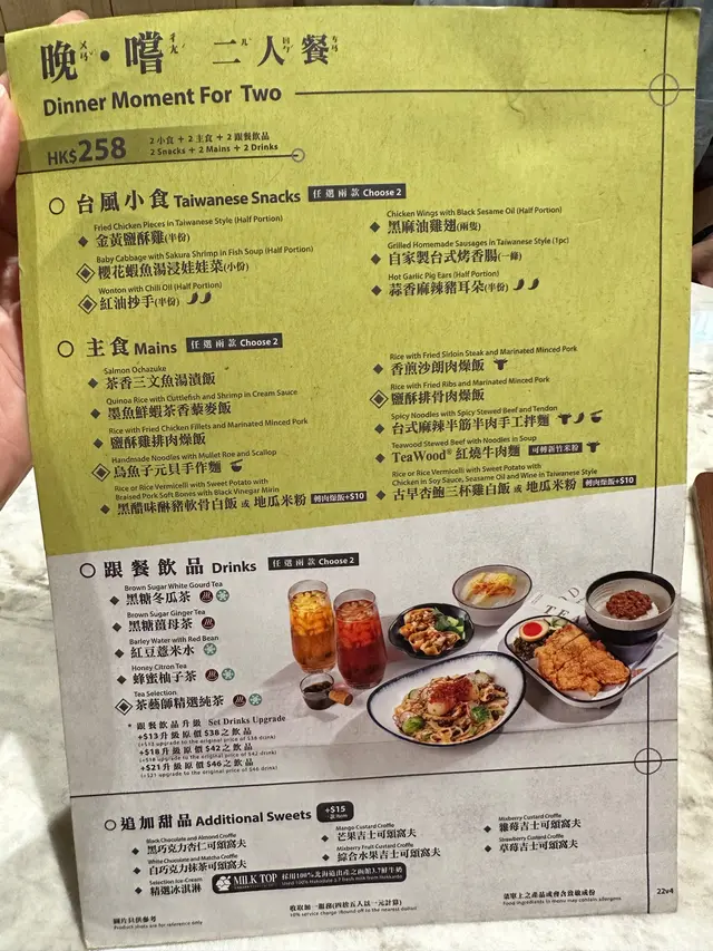 今次叫左個二人餐,包左兩個主食+兩個小食+兩杯飲品($258)