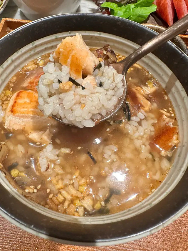 茶香三文魚湯漬飯 - 三文魚煎到岩岩好,而且好大條,加入湯漬同配料,味道升華,真係好好味,必食呀!