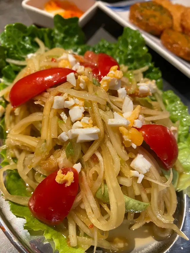 因為對花生敏感所以呢個沙律叫咗走花生。爽脆嘅木瓜絲,加上豆角洋蔥番茄仔,酸酸甜甜脆脆,特色嘅係加咗鹹蛋碎,增添一份鹹香。