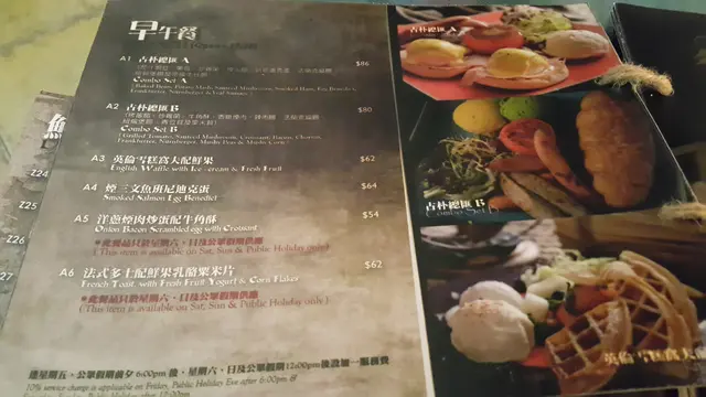 而古朴總匯 B $80 裡有烤蕃茄、炒雜菌、牛角酥、香脆煙肉、辣肉腸、法蘭克福腸、紐倫堡腸、青豆茸及粟米茸。
