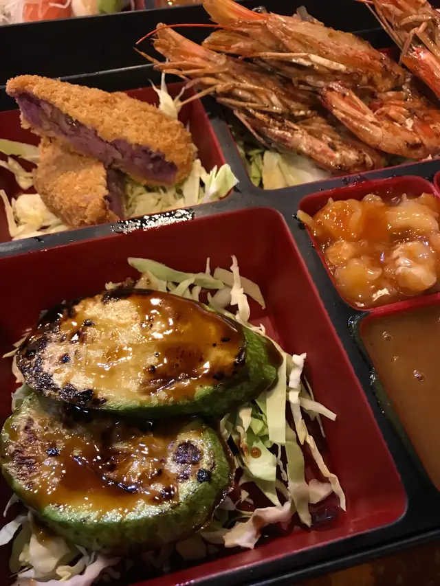 便當有吉列千層芝心豬扒1件、汁燒金菇牛肉卷2件、味付螺肉、三款刺身🍣(三文魚2件,帶子2件,有頭甜蝦🍤1隻)和咖喱飯。依個便當好足料,豬扒炸到好脆,豬扒中間仲有芝士🧀,食落真係好邪惡🤤,食炸豬扒就一定要點沙律醬,而汁燒金菇牛肉卷煎得幾香☺️,食落唔會太油,而牛肉食落唔會太乾,味付螺肉嘅味道都唔錯,3款刺身都切到好大件,特別係三文魚🍣,食落都好新鮮,而咖喱飯嘅咖喱味好香🍛,食落偏甜,仲有薯仔粒和紅蘿蔔🥕珍珠米煮得偏軟,配埋咖喱汁真係不錯😍
