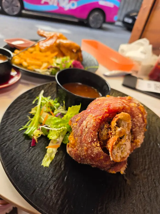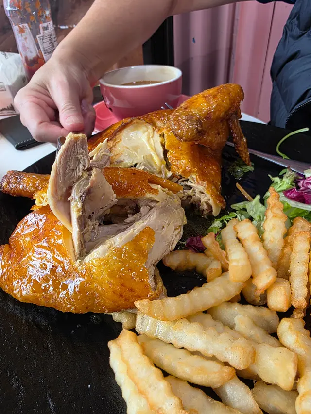 燒雞上枱時,眼見外皮呈深金色,薄脆乾爽,快點拍照來品嘗🍽️ 一咬下燒雞聽到令人療癒的「卡滋」聲,雞肉保留充足肉汁,不靠過重調味,單以雞香與微焦的皮香作主角,是難得的「越似簡單越難掌握」的西餐類型。套餐附上的炸薯條是見慣的配搭,炸得外脆內綿,是能與主菜平起平坐的存在。