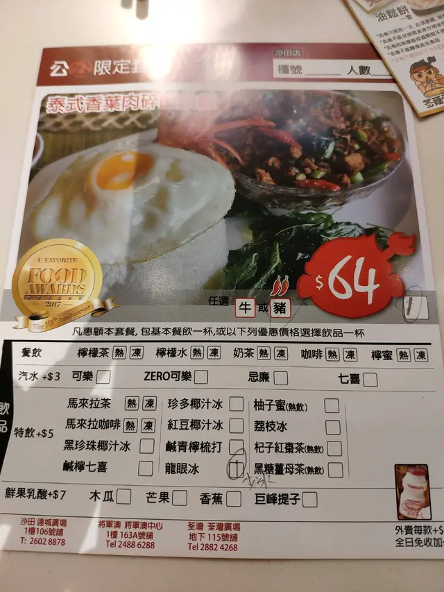 , 今日沙田逛街之後見到冬陰公公 ,突然想身邊朋友一直推薦冬蔭公公的香菜肉碎飯, 所以最後去試呢間嘅泰國菜,當時七點去到時還有空位所以很快就入座,不過二人要搭枱,位置空間有點細。而我們叫泰式香葉肉碎配白飯 +手抓餅+咖哩汁+龍眼冰+冬陰功湯麵。 食物上菜速度快。主打的香葉肉碎白飯有不錯的水準但個人認為太乾身進食時需要飲啖水才容易d吞,但其他食物有普普通通。整體而言食物質素普通,略帶味精味,不過勝在價錢不貴,在新城市廣場中算是cp較高的一間餐廳。只要不帶期望其實都ok的。