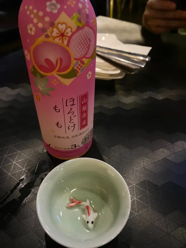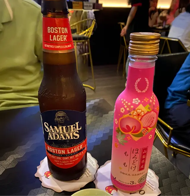 男士叫左craft beer, 女士無甘鍾意酒,但又覺得串燒應該配酒,就都一齊叫左支桃酒,甜甜地配串燒~ 餐廳個杯仔好得意,有條錦鋰係杯入面😍😍
