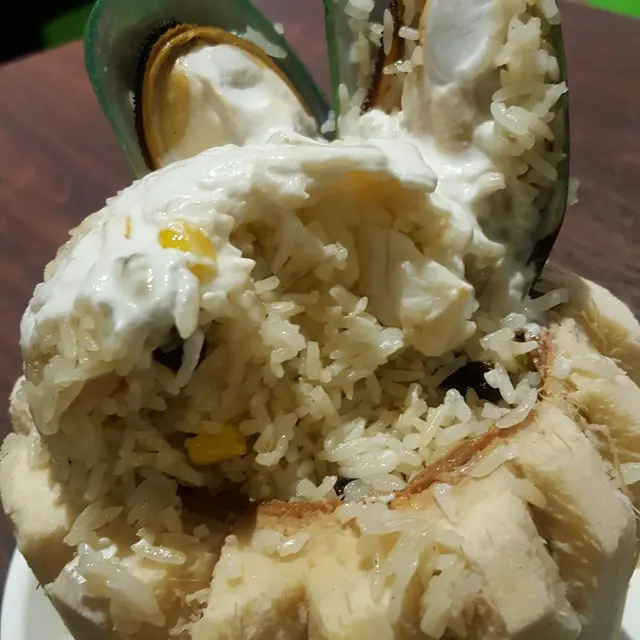 同樣又係份量超多既一款,椰青肉已經刮哂出黎,糯米飯粒塞滿左成個椰盅,兩個人食,每人都分到大約兩碗飯。裏面有提子乾、粟米粒、雜豆粒,仲有蝦同埋係面層既大大舊青口,椰漿飯味道幾香!