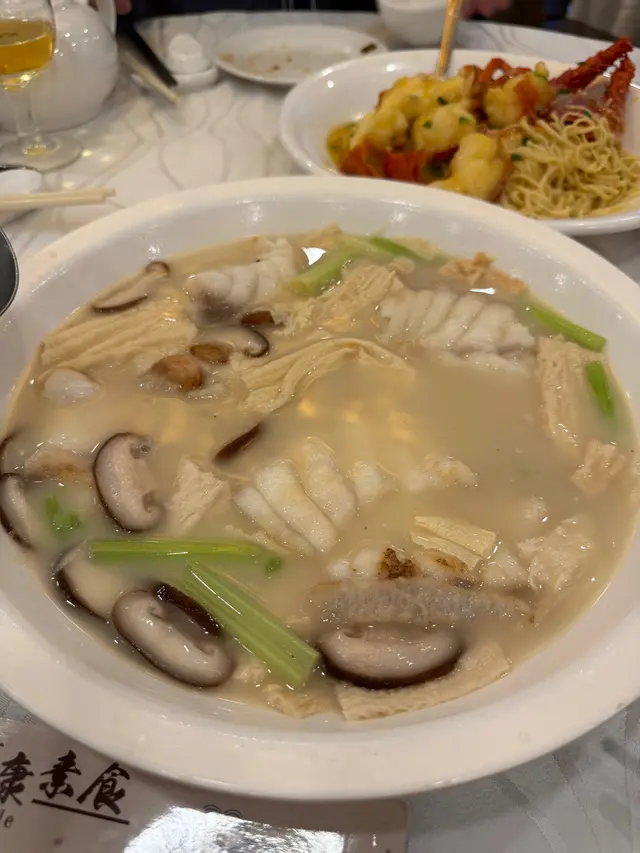 魚湯枝竹浸龍躉球清淡而鮮美的海鮮料理,魚骨熬製而成,湯底清澈,味道鮮甜,能夠充分襯托出魚丸的鮮味,龍躉球質地滑嫩,口感彈牙,帶有淡淡的魚香,搭配魚湯後,更加吸收了湯中的鮮味。