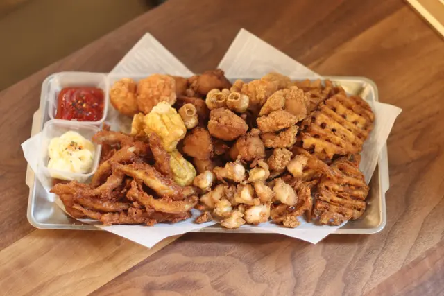 墨魚咀 、白飯魚、鹽酥菇 、大雞軟骨、燒賣 、薯格等等。每款都炸得很脆口,粉不會太厚。我最愛墨魚咀和大雞軟骨,喜歡它們的口感!