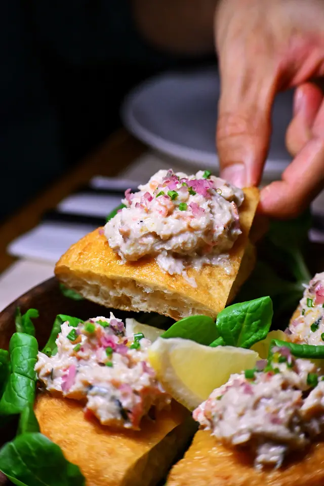 ▶︎ 香脆炸薄餅麵糰 鋪上鮮甜蟹肉 水牛芝士 番茄與新鮮羅勒 外脆內軟且不會很油