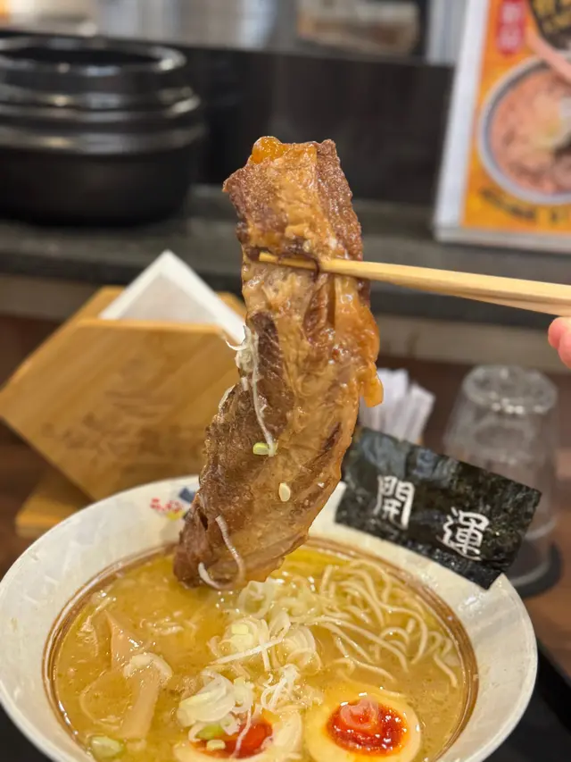 店員為我們送餐果一刻,碗內出現「開運」既紫菜,令人會心微笑一下,食完拉麵感覺很幸福🥰,原條豬軟骨唔講笑,真係好好食,佢入口很腍滑,最好食係軟骨部份,真係食得出用左長時間炆,又唔會乾柴,再配溏心蛋,為呢餐劃上完美句號。