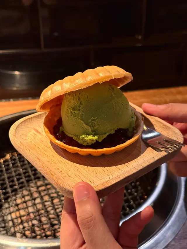 抹茶雪糕+紅荳蓉配香脆餅底,一解和牛嘅膩