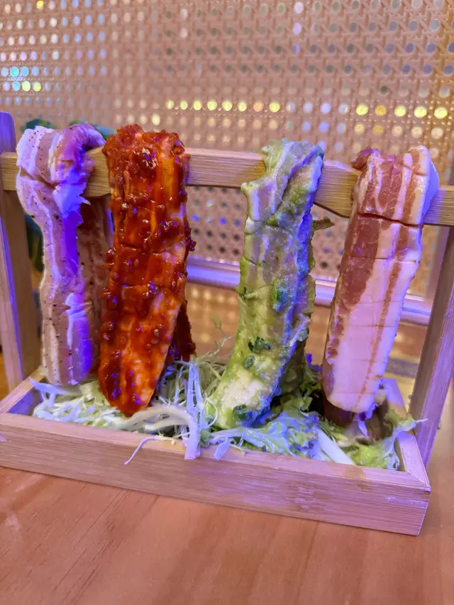 四味五花肉是此店的熱賣菜式,分別有(黑椒鹽,韓式醬汁,蔥蒜,果味醬汁),成條上嘅五花肉真係第一次見,仲要有咁多款口味。